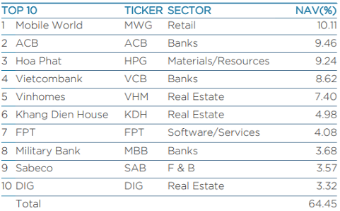 Về cơ cấu danh mục đầu tư, MWG tiếp tục là cổ phiếu lớn nhất danh mục VEIL với tỷ trọng 10,11%, xếp tiếp theo lần lượt là ACB (9,46%), HPG (9,24%), VCB (8,62%), VHM (7,4%)…