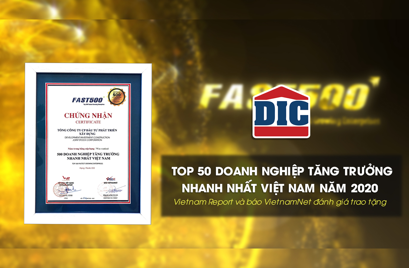 On 15th Sept 2020, the Fast 500 Ranking Announcement Ceremony (Fast500) was broadcast on the online platforms of Vietnam Report Joint Stock Company (Vietnam Report) and VietNamNet online newspaper in the context of COVID-19 epidemic. DIC Group (HoSe: DIG) has excellently surpassed many enterprises to rank 50/500 (Aggregated chart of 500 fastest growing enterprises in Vietnam).