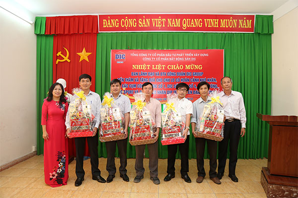 Từ ngày 2 – 7/02/2018, Đoàn do bà Phan Thị Mai Hương – Chủ tịch Công đoàn DIC Group làm trưởng đoàn đã đến thăm hỏi và tặng quà cho 130 NLĐ khó khăn tại các đơn vị: DIC Vật Liệu; DIC Resco; DIC 1; DIC 2; DIC 4; DIC Betong; DIC Sport; DIC Phương Nam và DIC T&T. Ban chấp hành Công đoàn DIC Group cũng đến chúc Tết, nắm bắt tình hình chăm lo Tết cho NLĐ và tặng mỗi đơn vị 1 phần quà trị giá 1 triệu đồng.