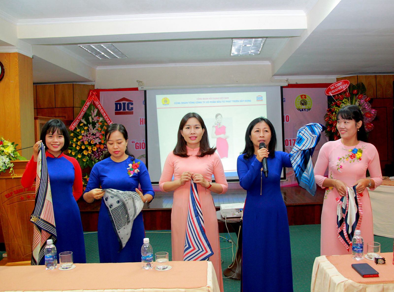 Bà Phan Thị Mai Hương, Chủ tịch Công đoàn DIC Group hướng dẫn “Kỹ năng làm đẹp mùa xuân” cùng khăn choàng