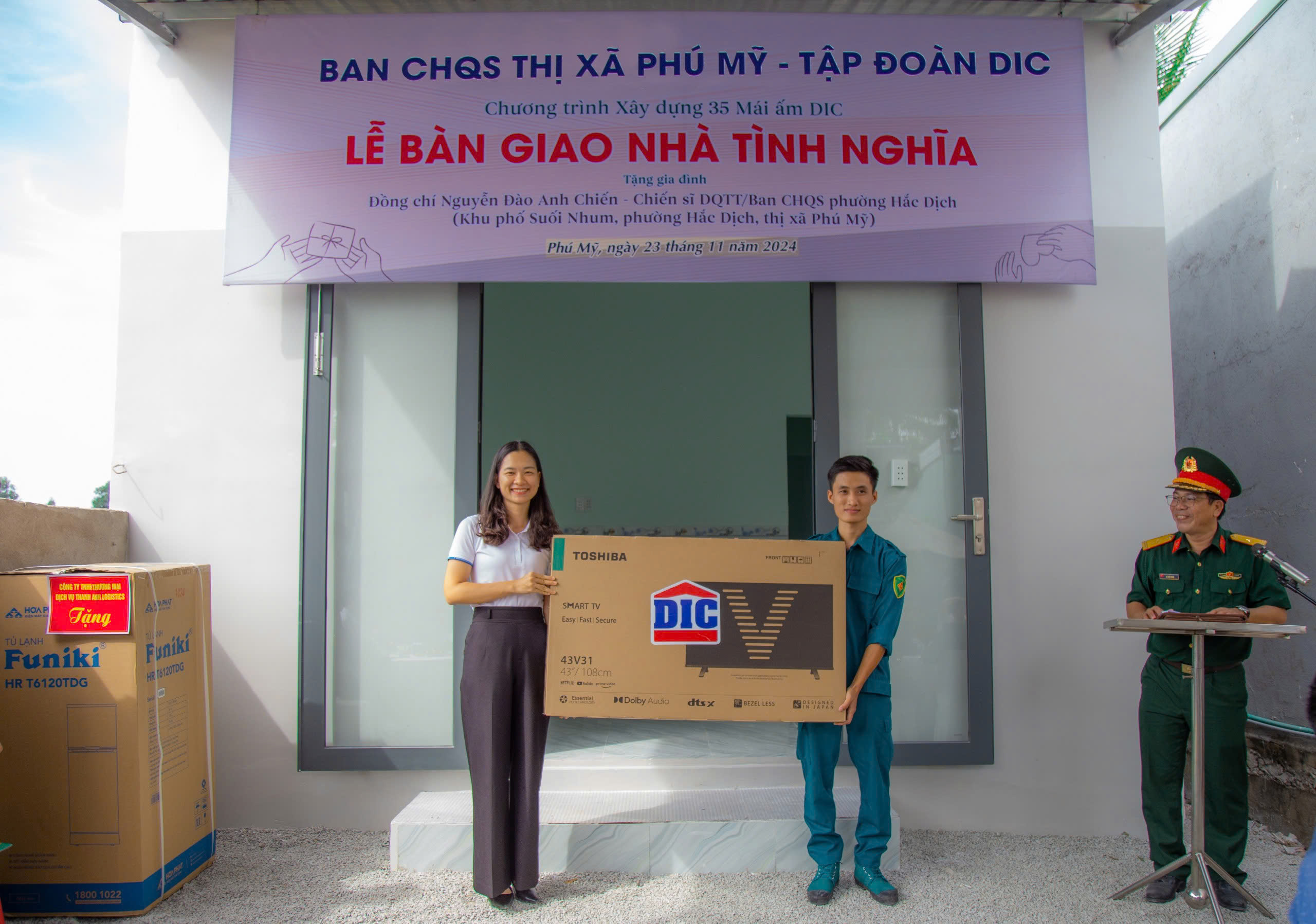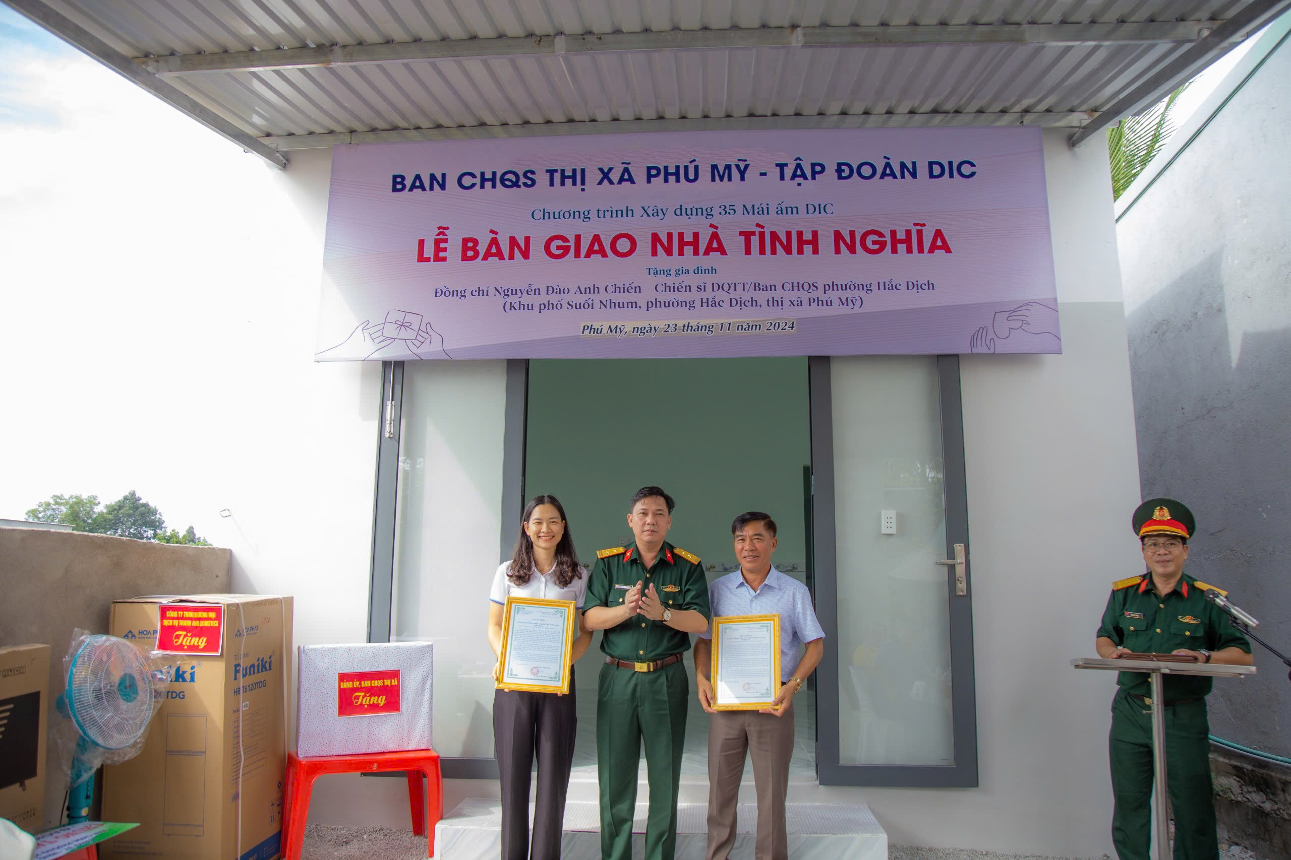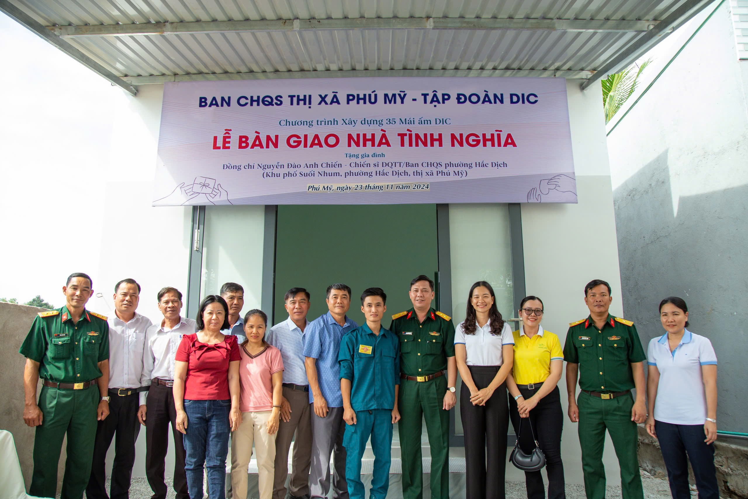 Thiết thực chào mừng kỷ niệm 80 năm Ngày thành lập Quân đội nhân dân Việt Nam (22/12/1944-22/12/2024) và 35 năm Ngày hội Quốc phòng toàn dân (22/12/1989-22/12/2024), sáng ngày 23/11, Tập đoàn DIC đã phối hợp cùng Ban Chỉ huy Quân sự thị xã Phú Mỹ tổ chức “Lễ khánh thành và bàn giao Nhà tình nghĩa” cho đồng chí Nguyễn Đào Anh Chiến - dân quân thường trực phường Hắc Dịch, thị xã Phú Mỹ.