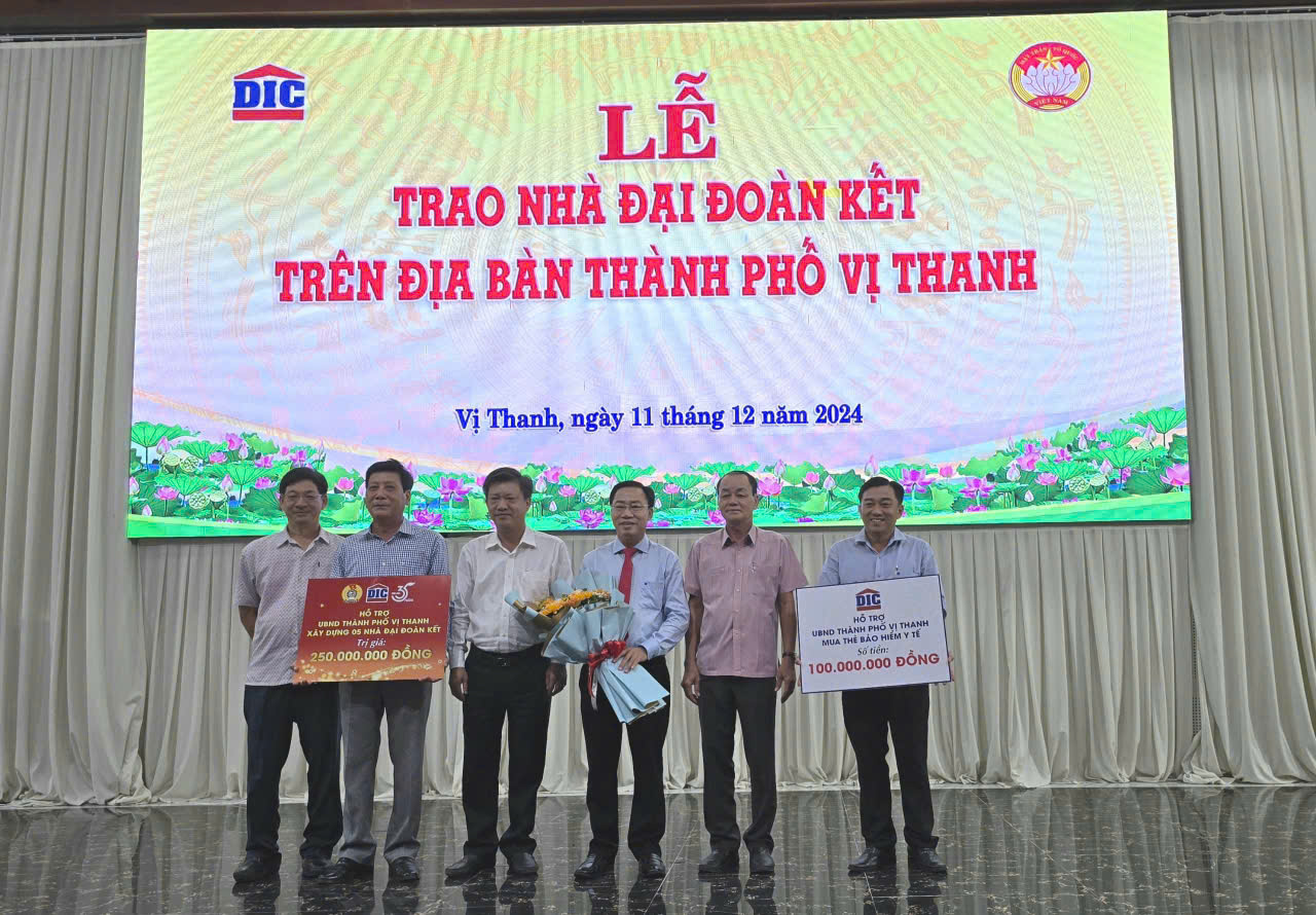 Chiều ngày 11/12/2024, ông Phạm Văn Thái – Phó Tổng Giám đốc Tập đoàn DIC đã trao kinh phí hỗ trợ với tổng giá trị 350 triệu đồng cho Ủy ban MTTQ Việt Nam thành phố Vị Thanh. Trong đó, 250 triệu đồng ủng hộ xây dựng 5 căn nhà Đại đoàn kết (nằm trong chương trình “Xây dựng 35 Mái ấm DIC”) và 100 triệu mua Bảo hiểm y tế cho người dân khó khăn.