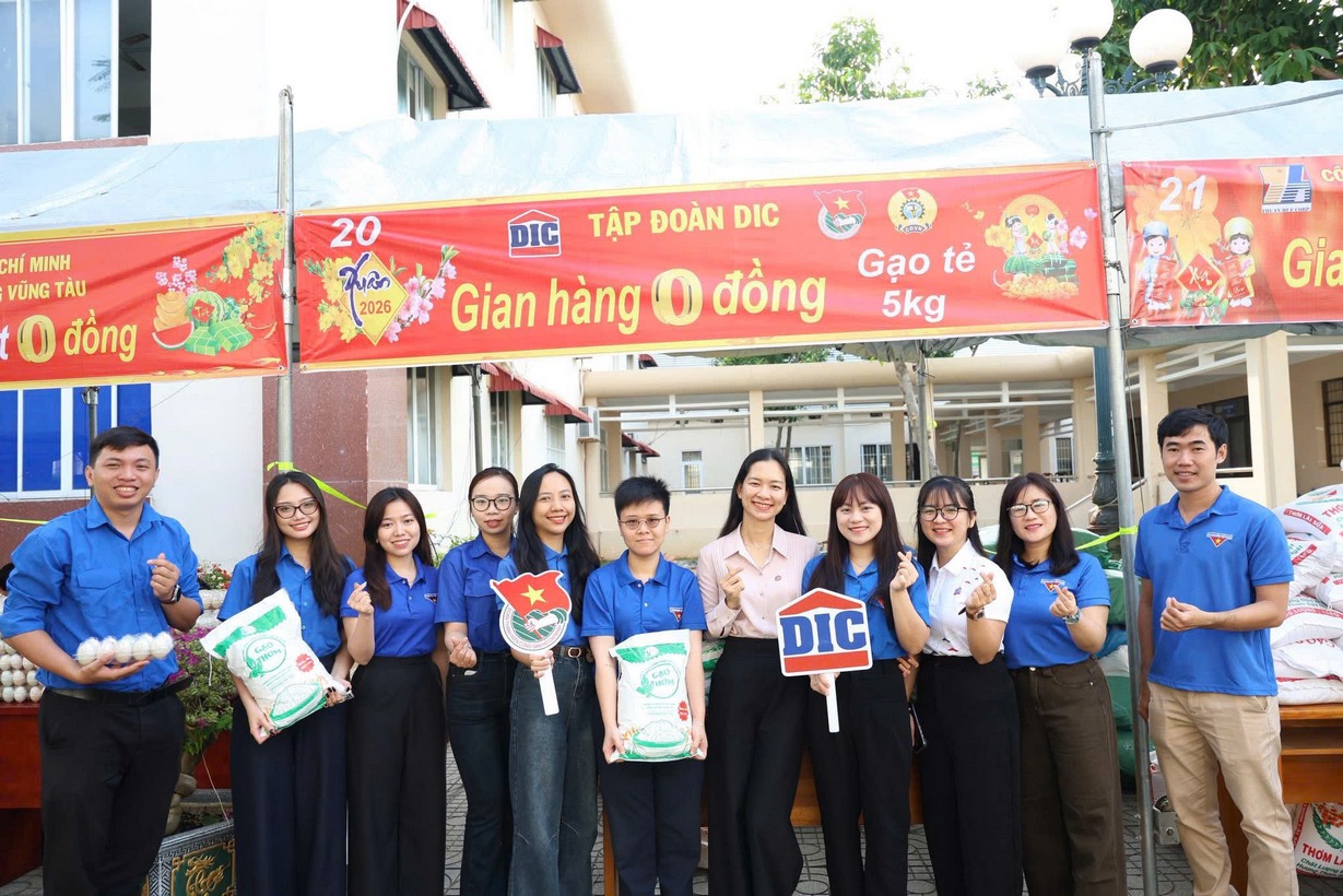 Sáng ngày 07/02/2026, tại Ủy ban Mặt trận Tổ quốc Việt Nam phường Vũng Tàu, Công đoàn và Đoàn Thanh niên Tập đoàn DIC đã tham gia Phiên chợ 0 đồng với chủ đề “Xuân đoàn kết – Tết nghĩa tình”. Tại đây Tập đoàn DIC đã trực tiếp trao tặng 5 tấn gạo đến người dân có hoàn cảnh khó khăn trên địa bàn phường.
