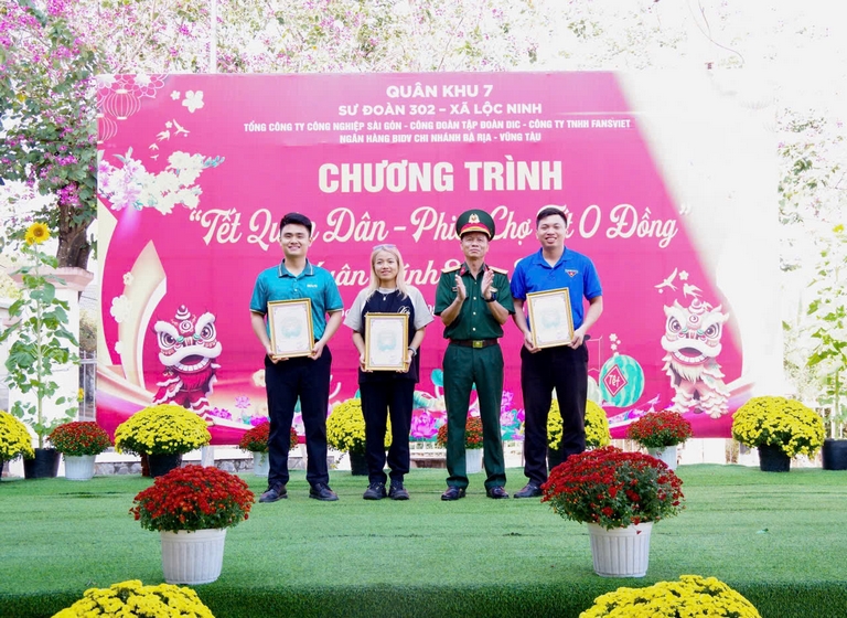 Tiếp nối hành trình sẻ chia, Công đoàn và Đoàn Thanh niên Tập đoàn DIC trao tặng 200 xuất quà (mỗi suất trị giá 500.000 đồng) trong khuôn khổ Chương trình “Tết Quân – Dân” do Sư đoàn 302, Trung đoàn Minh Đạm (thuộc Bộ Tư lệnh Thành phố Hồ Chí Minh) và Ban Chỉ huy Quân sự phường Tân Phước tổ chức.