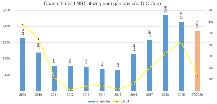 Năm 2020 DIC Corp đặt mục tiêu đạt 2.500 tỷ đồng doanh thu và 650 tỷ đồng lợi nhuận trước thuế. Như vậy kết thúc 9 tháng đầu năm công ty đã thực hiện được gần 75% kế hoạch doanh thu nhưng còn cách rất xa chỉ tiêu lợi nhuận được giao.