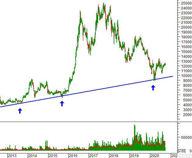 Điểm đáng chú ý nhất là đường trendline dài hạn (kéo dài từ tháng 01/2012 đến nay) đã liên tục hỗ trợ hiệu quả cho giá cổ phiếu AAA trong những đợt điều chỉnh mạnh. Trong đợt sụt giảm đầu năm 2020, giá đã quay đầu tăng trở lại sau khi test ngưỡng này.