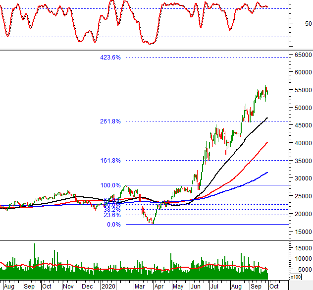 Mục tiêu trong thời gian tới là vùng 64,000-65,000 (tương đương ngưỡng Fibonacci Retracement 423.6%). Ngưỡng hỗ trợ ngắn hạn là vùng 47,000-48,000 (tương đương Fibonacci Retracement 261.8%).