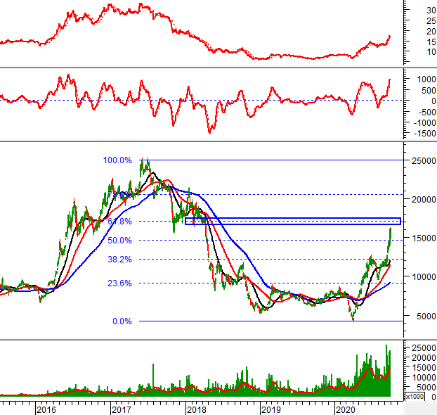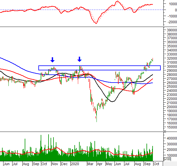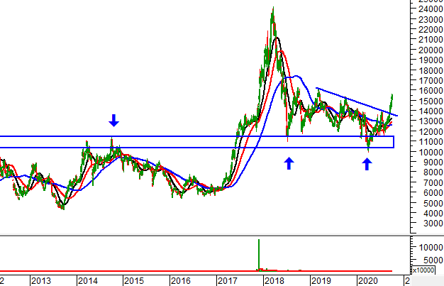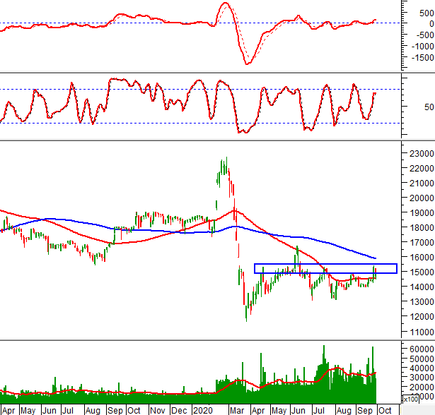 Giá hiện tại đang test lại vùng 14,900-15,300 (đỉnh cũ tháng 07/2020). Nếu giá cổ phiểu có thể phá vỡ hoàn toàn vùng này trong thời gian tới thì mục tiêu tiếp theo sẽ là đường SMA 200 ngày (quanh mức 16,000).