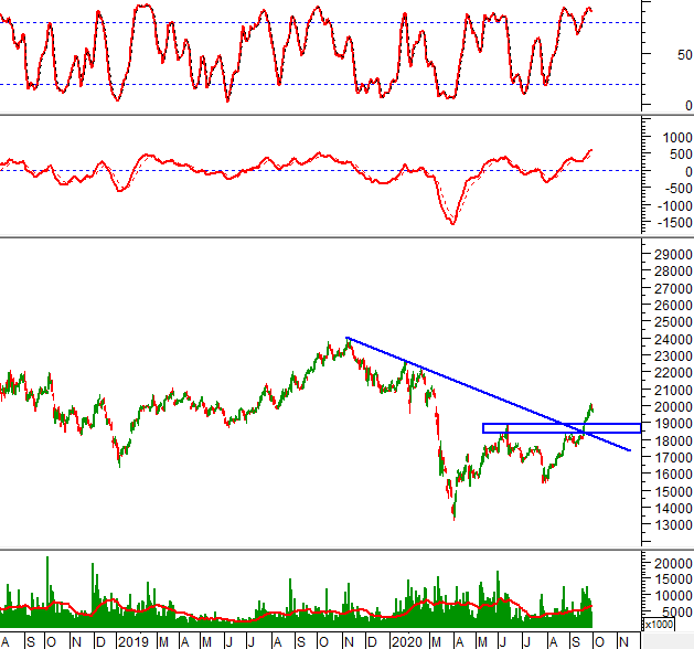 Giá đã phá vỡ trendline trung hạn (bắt đầu từ tháng 11/2019) và đỉnh cũ tháng 06/2020. Theo lý thuyết phân tích kỹ thuật, các ngưỡng này sẽ chuyển từ kháng cự thành hỗ trợ mạnh trong thời gian tới nếu giá cổ phiếu MBB throwback trở lại trong tương lai.