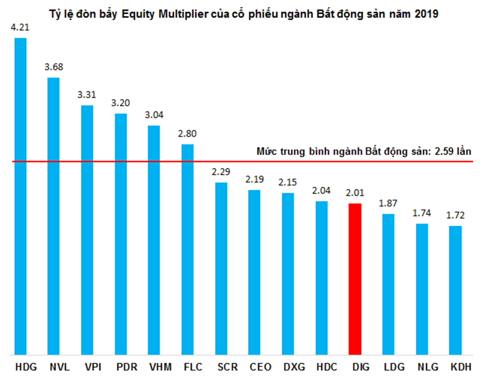 Tỷ lệ đòn bấy Equity Multiplier năm 2019 của DIG đạt 2.01 lần và nằm ở mức dưới trung bình ngành là 2.58 lần. Nếu so sánh với các doanh nghiệp cùng ngành bất động sản thì DIG thuộc nhóm doanh nghiệp sử dụng đòn bẩy tài chính thấp.