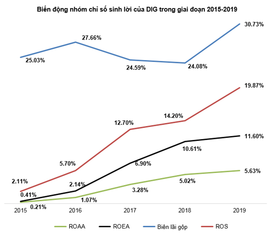 Hiệu quả sinh lời trên vốn chủ sở hữu bình quân (ROEA), hiệu quả sinh lời trên tổng tài sản bình quân (ROAA) hay hiệu quả sinh lời trên doanh thu (ROS) của DIG trong giai đoạn 2015-2019 đều duy trì được đà tăng. Những con số trên cho thấy DIG đã sử dụng rất tốt nguồn vốn huy động.