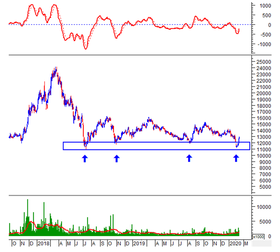 Trong đợt điều chỉnh mạnh của thị trường đầu năm 2020, giá cổ phiếu DIG đã về lại đáy cũ của năm 2018 (tương đương vùng 11.000-12.000). Sau khi test vùng này, giá đã phục hồi mạnh mẽ trở lại.