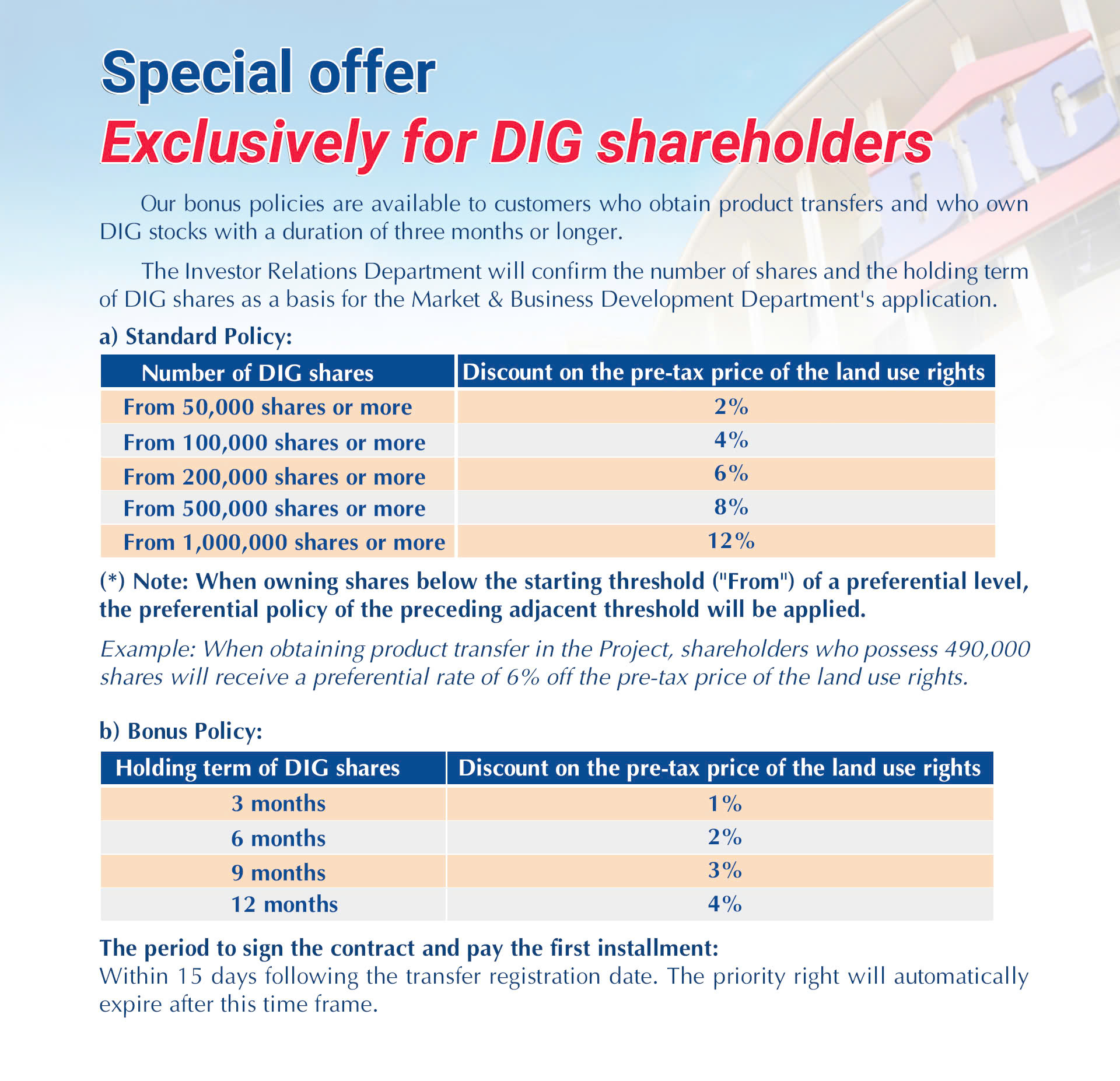 In addition to preferential programmes for wholesale customers and employees, DIC Group will implement a special policy exclusively for shareholders owning DIG stock code. This policy seeks to achieve the DIC Group's commitment to increasing investment value for DIG shareholders.