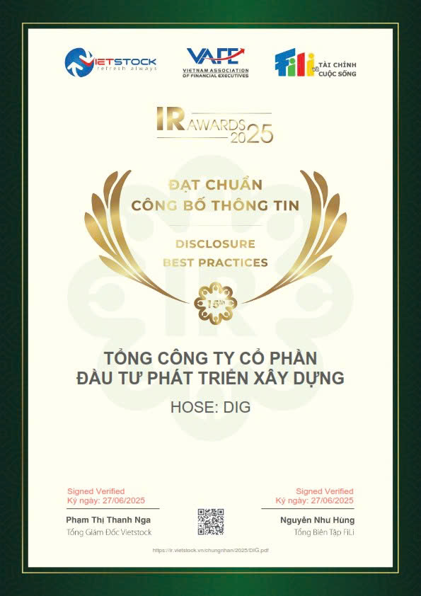 Ngày 01/7/2025, chương trình IR Awards 2025 chính thức công bố “Báo cáo khảo sát toàn diện về hoạt động công bố thông tin trên thị trường chứng khoán Việt Nam”. Trên cơ sở kết quả đánh giá từ báo cáo, Tập đoàn DIC (Tổng CTCP Đầu tư Phát triển Xây dựng, HoSE: DIG) đã xuất sắc nằm trong danh sách “Doanh nghiệp đạt chuẩn công bố thông tin năm 2025”.